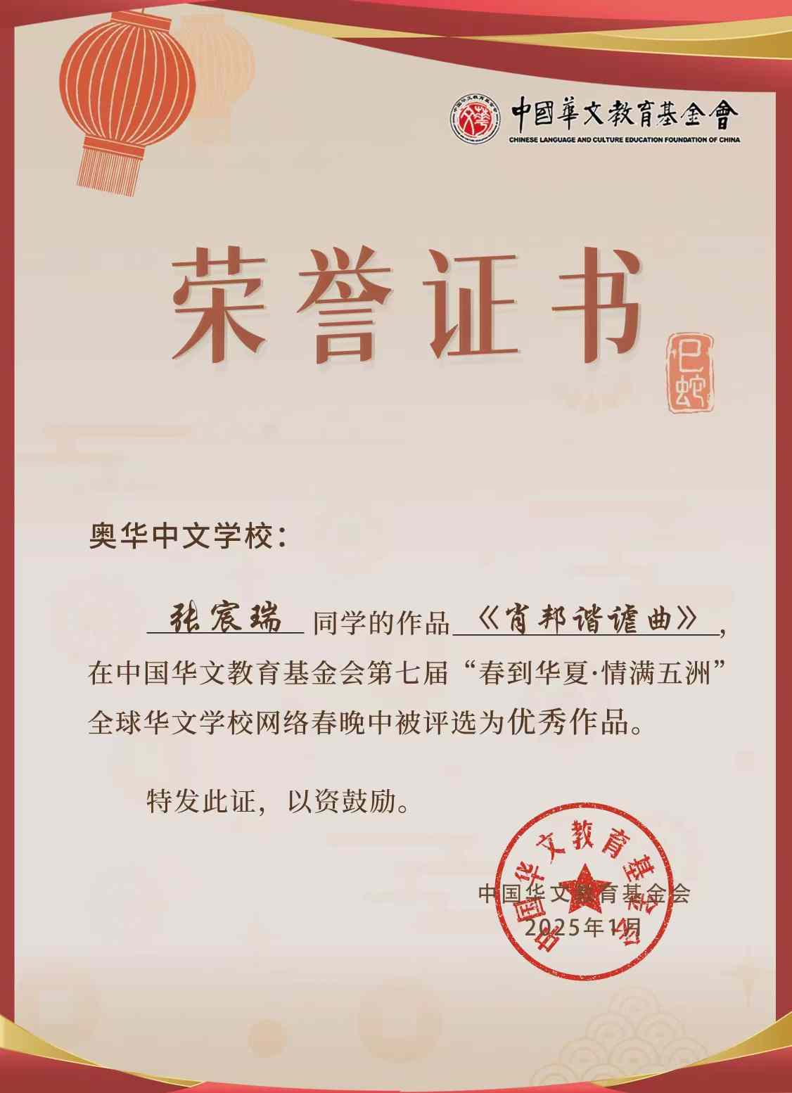 奥华中文学校始终致力于提供优质的华文教育,培养学生在艺术和学术领域的综合素养,张宸瑞同学的成就为学校增光添彩。